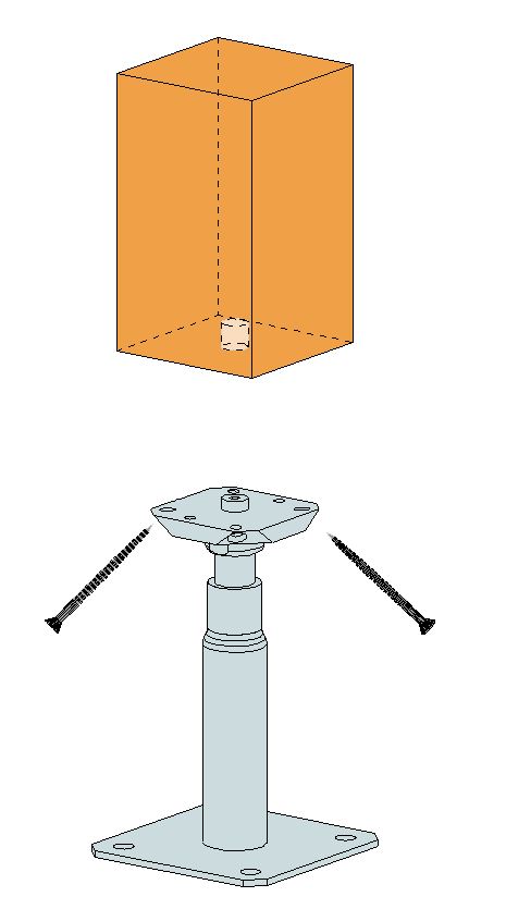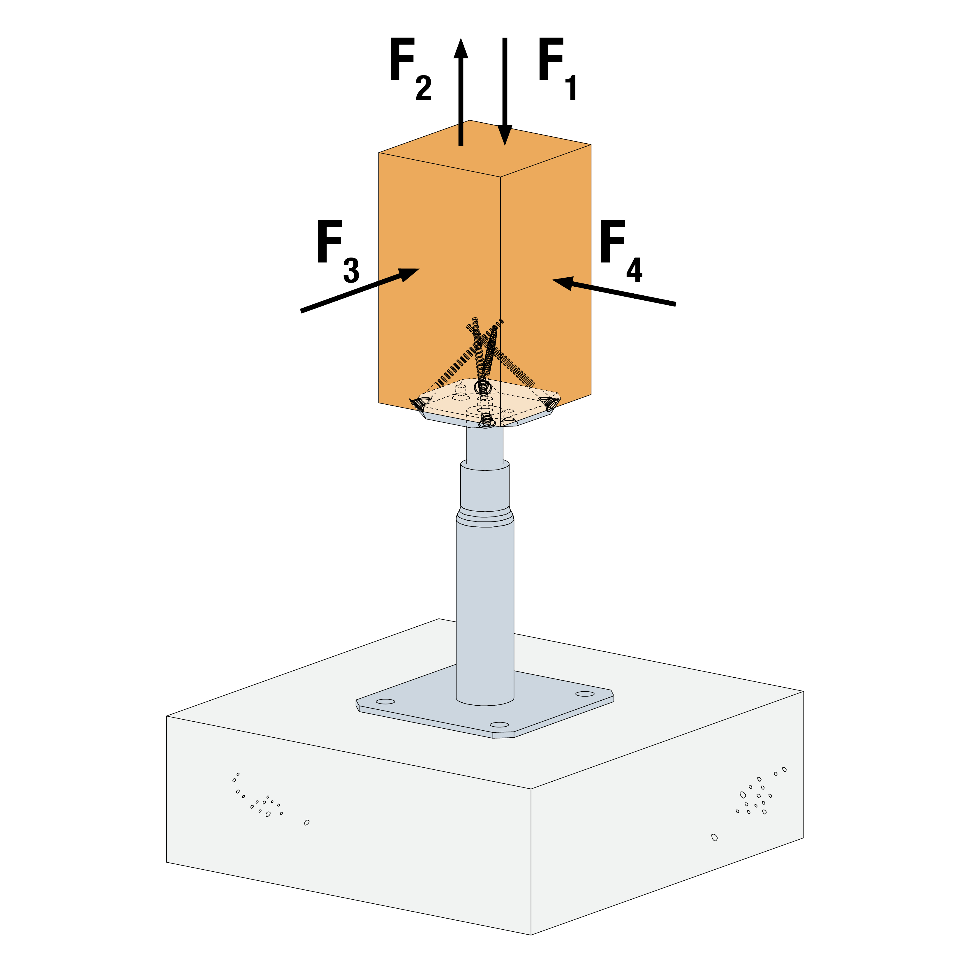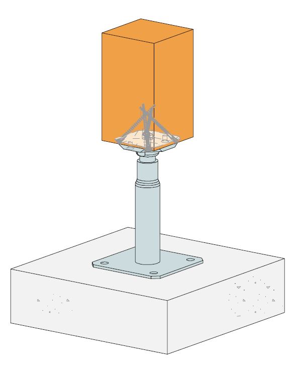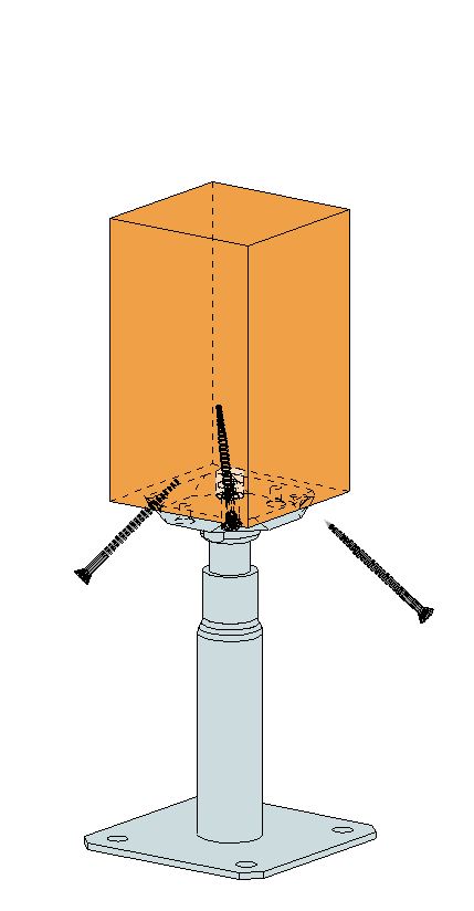 Fix to the foundation with concrete/mechanical anchor system. Fix to the post using Ø6mm skewed screws. A center hole Ø16mm help with the placing of PPC at the column.