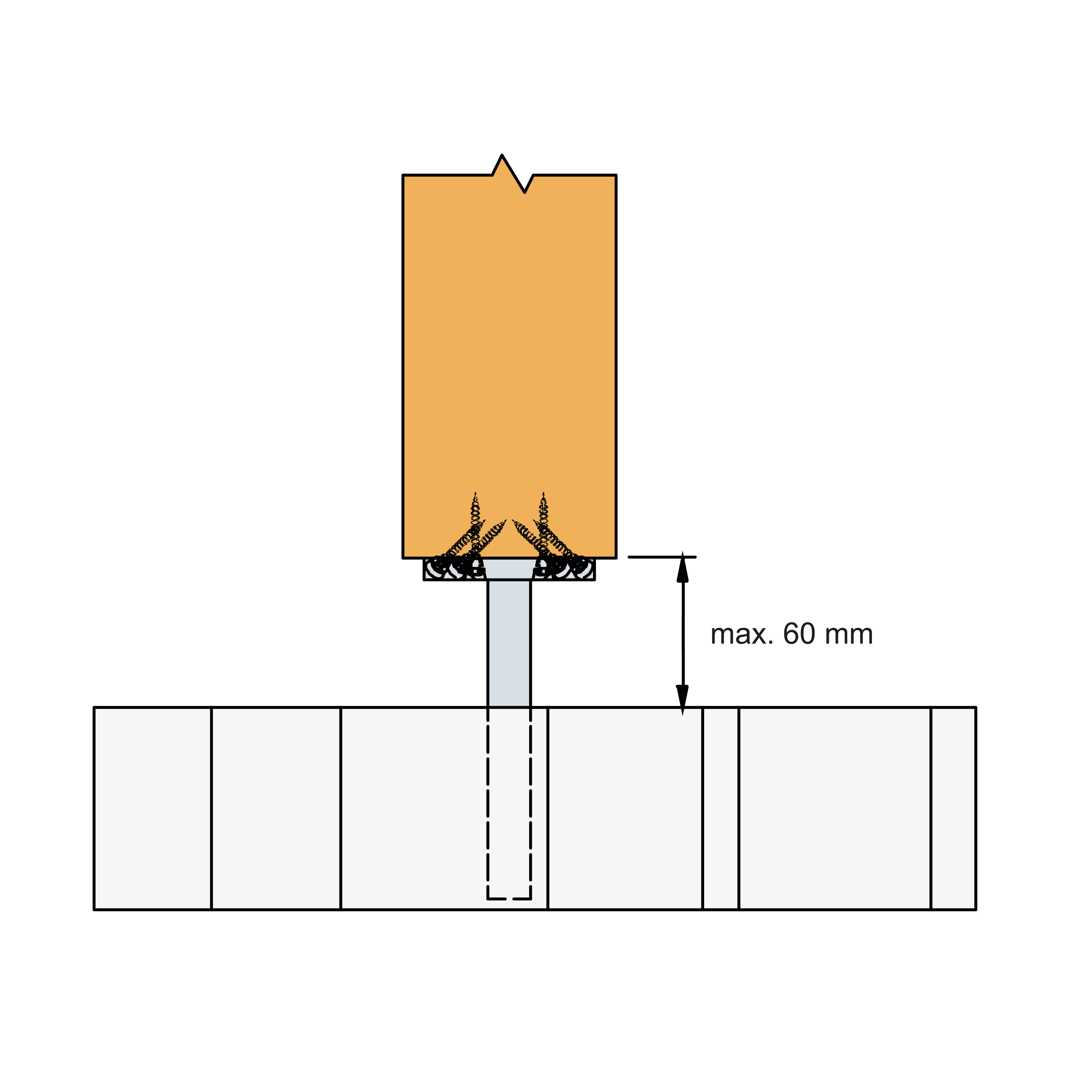 • Der Anschluss am Holz erfolgt mit Senkkopfschrauben 6,0 x 60 mit Vollgewinde, die unter 45° in die Stütze eingeschraubt werden.