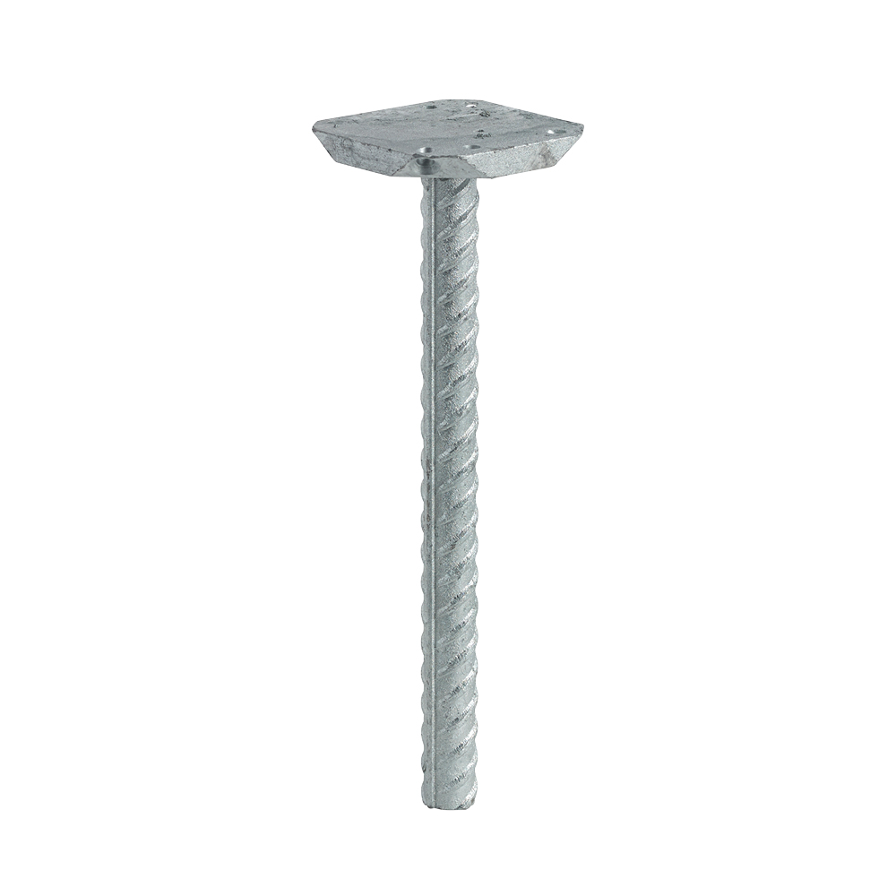 • Der PP Stützenfuß ist stückverzinkt und besteht aus einer Kopfplatte mit einem angeschweißten Betonrippenstahl Ø20 mm.
